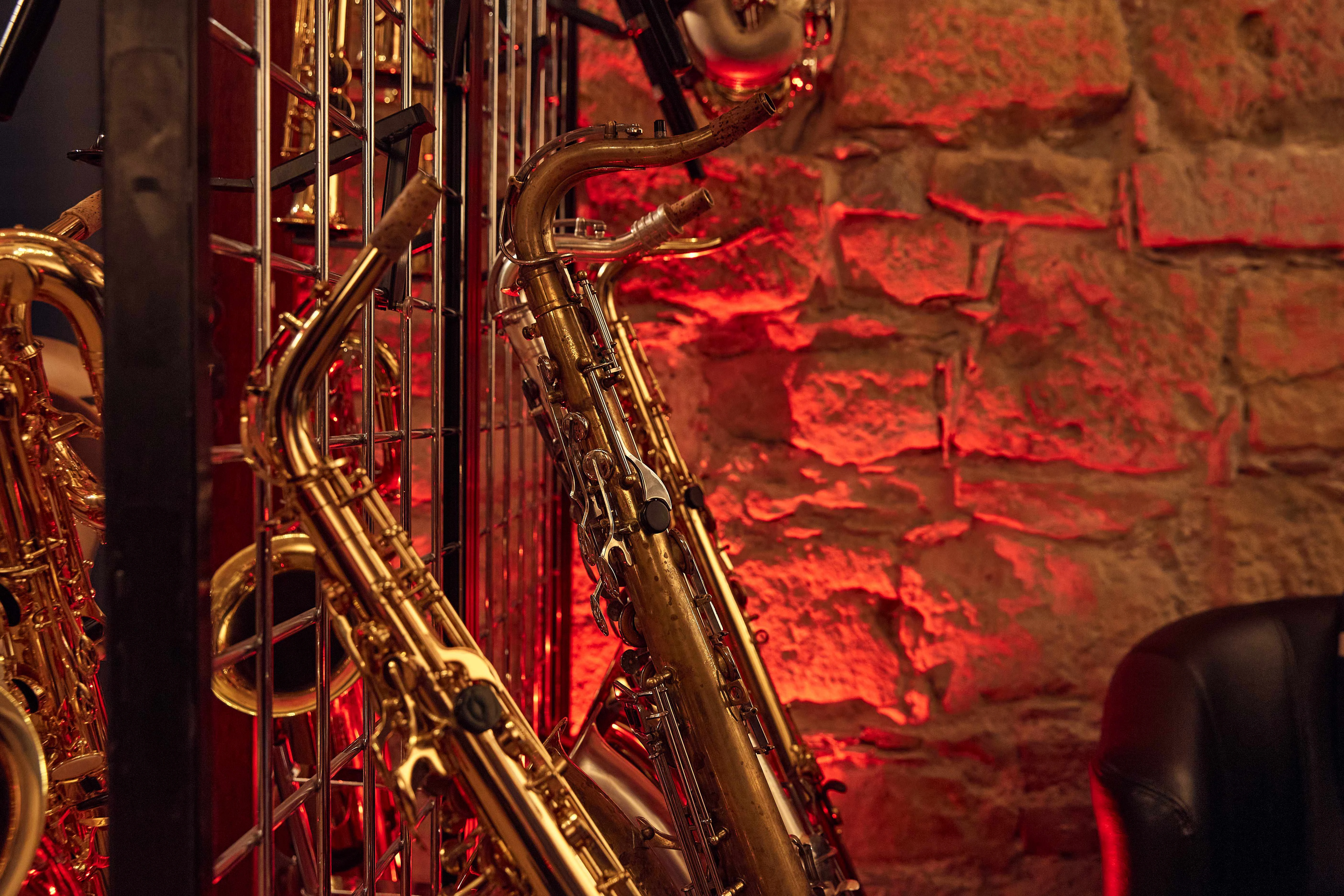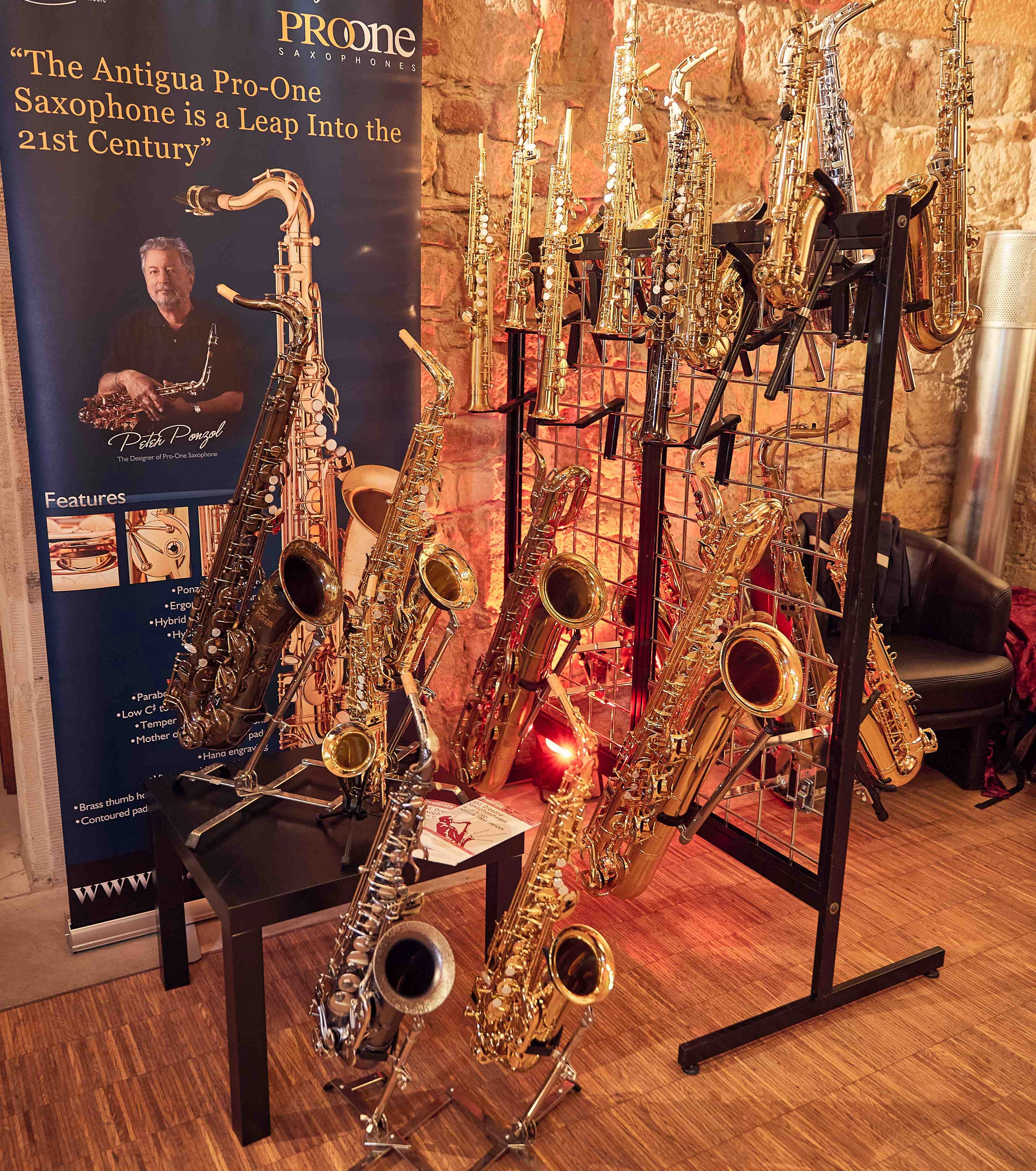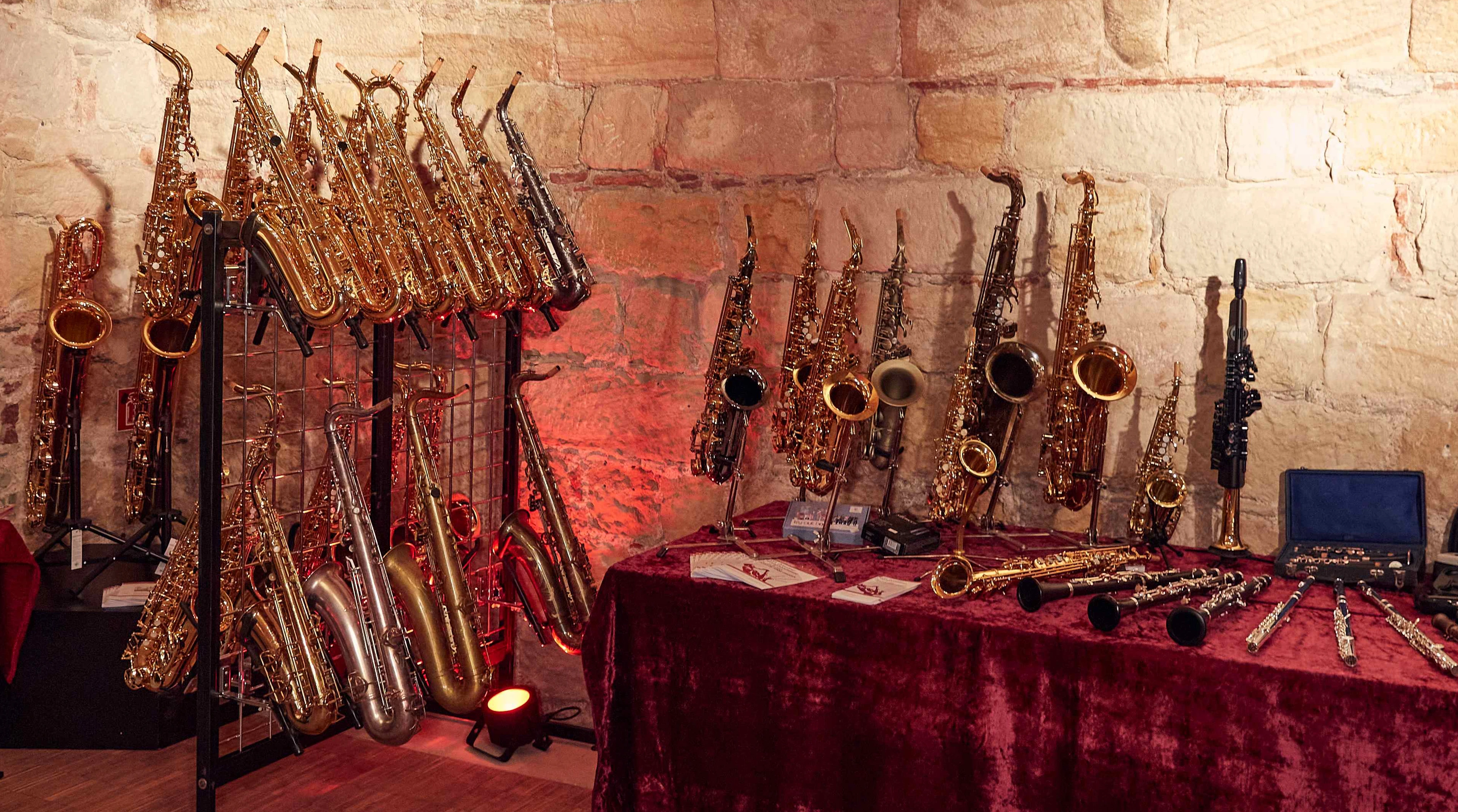 Die Ausstellung präsentiert Neuinstrumente vieler Marken in verschiedenen Preisklassen. Ein Sortiment Vintageinstrumente sowie verschiedenes Zubehör erweitern das Angebot.. Es stehen auch einige Flöten und Klarinetten zur Verfügung. Alle Instrumente können getestet werden und stehen zum Verkauf.