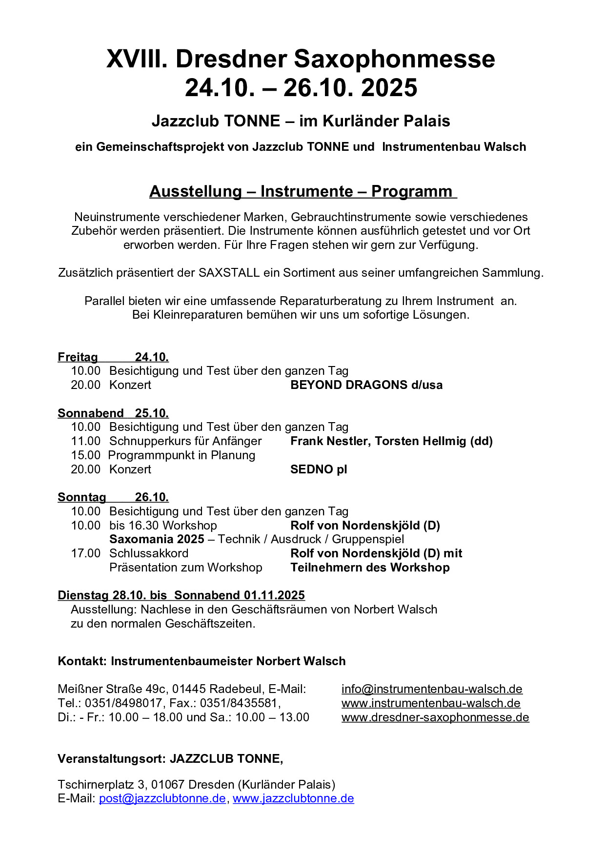 XVIII. Dresdner Saxophonmesse – 24. bis 26.10. 2025 – im Jazzclub TONNE